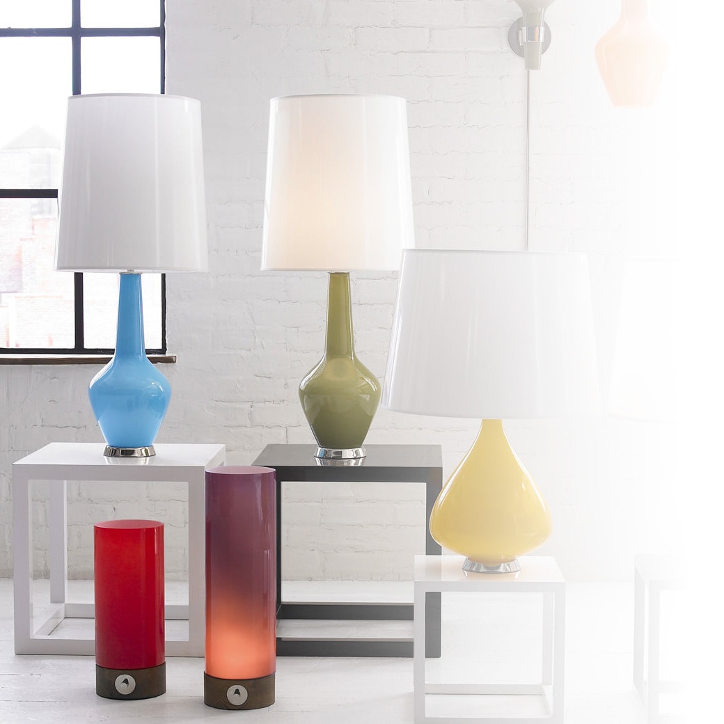 Each Capri Accent Lamp is hand-blown with a milk glass interior and a bold colored outer layer. The result: lustrous, opaque, poppy and crafty, with polished nickel accents. Place one on each nightstand for a pop of color and a swoon-worthy silhouette.